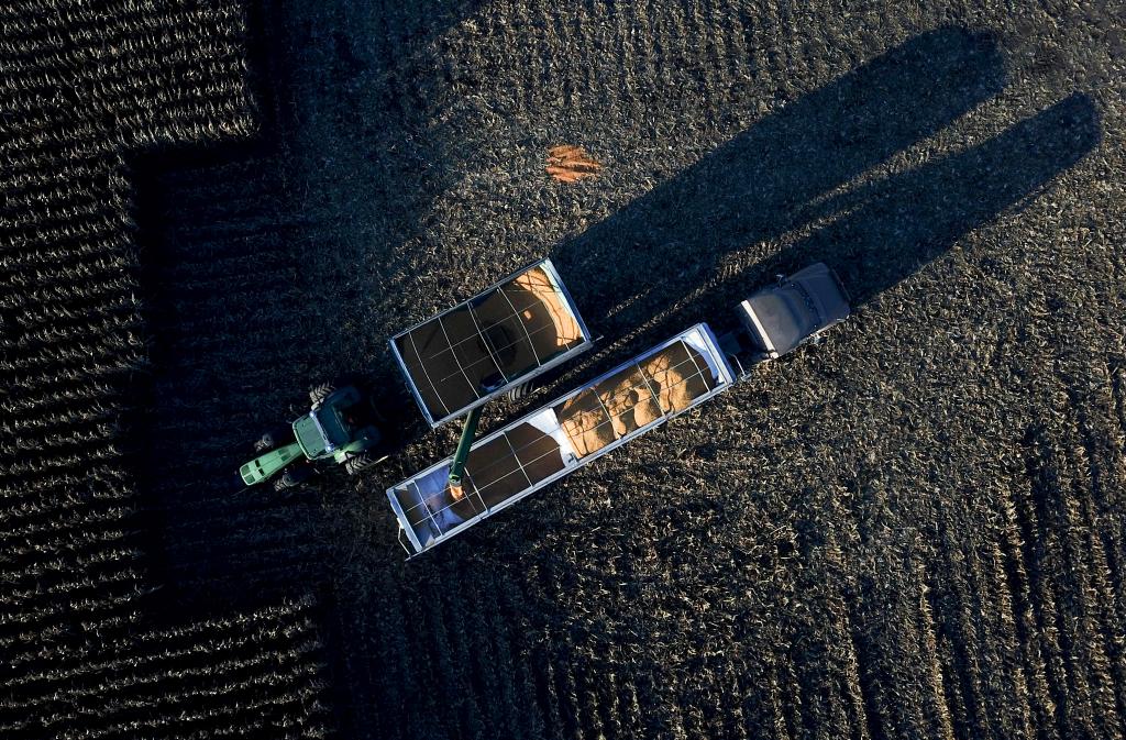 2019年10月17日,在美国艾奥瓦州,粮食中转车在一家农场将大豆装进卡车。新华社发