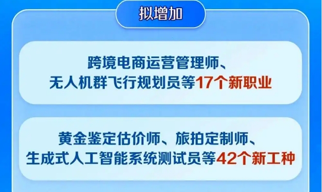 近日,人社部宣布擬新增跨境電商運營管理師、無人機群飛行規劃員等17個新職業,以及生成式人工智能系統測試員、睡眠健康管理師等42個新工種。這些新職業、新工種既是產業變革的縮影,也是對社會高質量發展需求的生動回應。新職業持續涌現,開啟了時代創造的無限可能。面對職業選擇,不少年輕人主動擁抱變化,抓住新賽道。