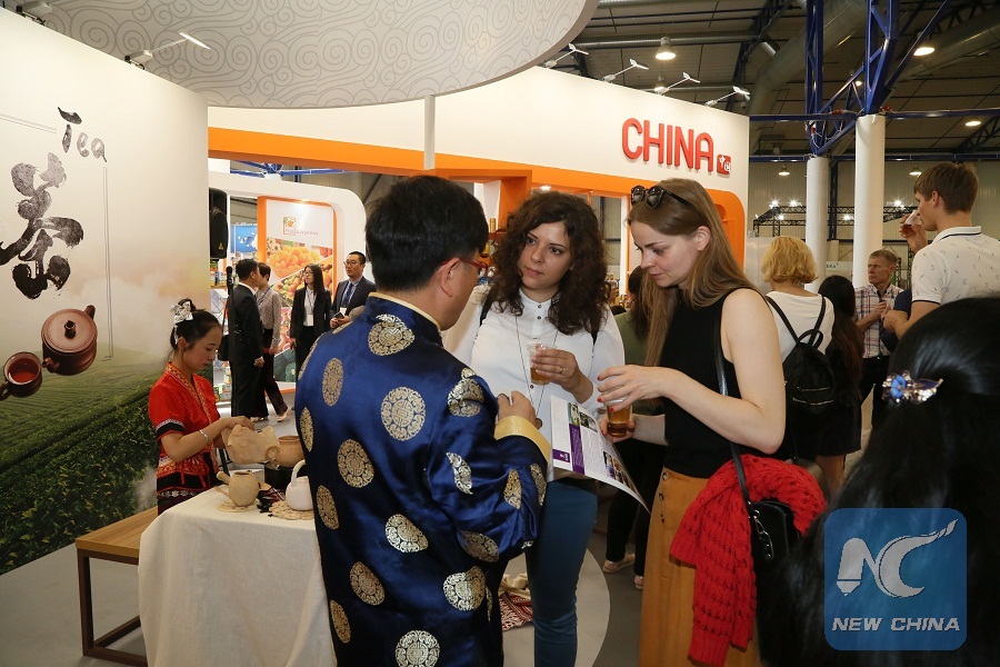 People visit Chinese stand during the International Exhibition for Agriculture and Food Industry AgroBalt 2018 in Vilnius, Lithuania, on May 24, 2018. The International Exhibition for Agriculture and Food Industry AgroBalt 2018, which started on Thursday in Vilnius, attracted 200 participants from 24 countries, including a big delegation from China. (Xinhua/Guo Mingfang)