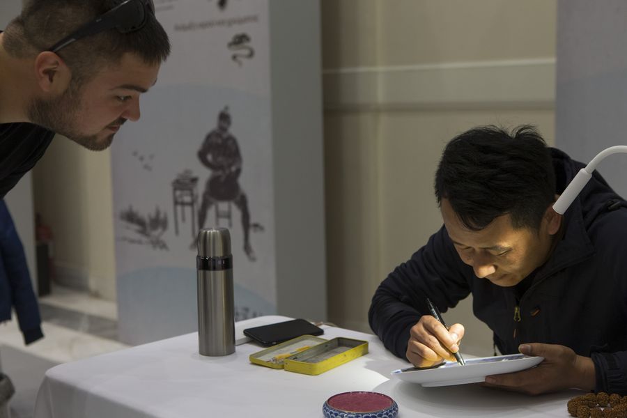A visitor watches an artisan painting on a porcelain plate at the exhibition "Porcelain Journey along Silk Road - On Site Performance of the Traditional Porcelain Shaping Technique" in Athens, Greece, on Dec. 20, 2019.(Xinhua/Marios Lolos)