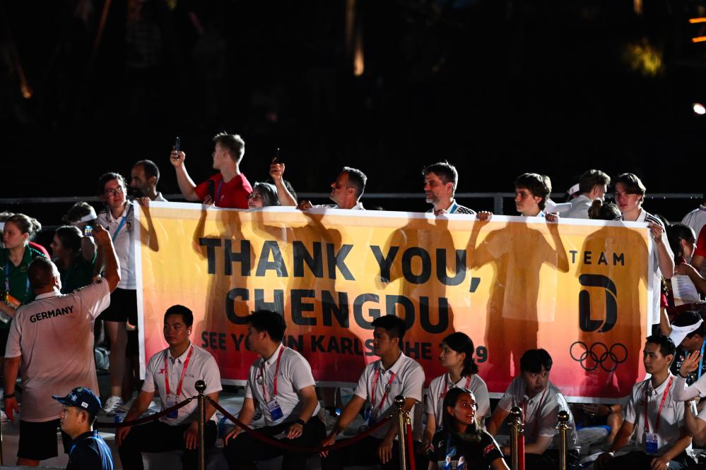这是8月17日在闭幕式现场拍摄的感谢成都的条幅。新华社记者 冯开华 摄