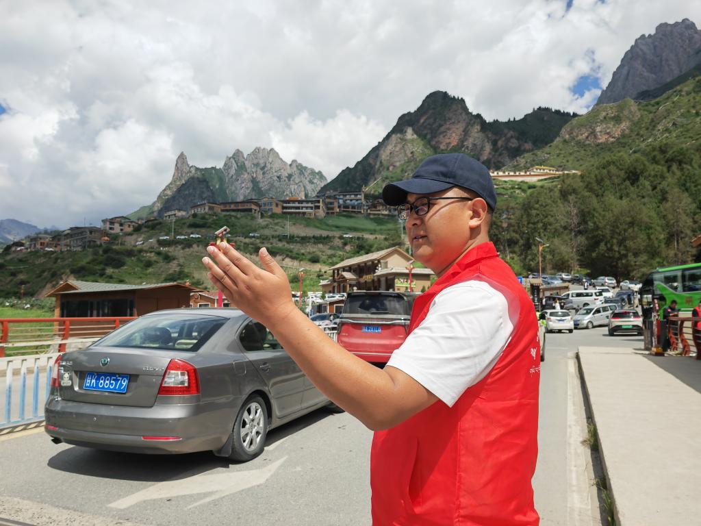 熙熙攘攘中,有群“红马甲”在忙前忙后。他们疏导交通、提供志愿讲解、给游客调解旅途中出现的各类纠纷,哪里有需要他们就出现在哪里。扎尕那村党支部书记班代交便是其中一员。