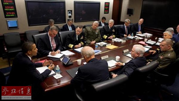 ??? 資料圖:2009年10月,美國總統(tǒng)奧巴馬在白宮時(shí)局值班室與美軍參謀長聯(lián)席會(huì)議成員及高級(jí)軍事顧問商討阿富汗作戰(zhàn)事宜。