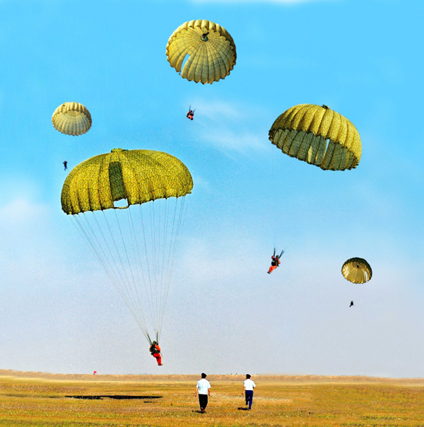 ????2001年6月,航天員在湖北進行跳傘訓練。新華社發(朱九通 攝)