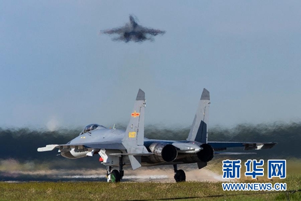 空軍“先鋒飛行大隊”飛行員依次駕機升空,開展空戰對抗訓練(9月7日攝)。 新華社發(萬全 攝)