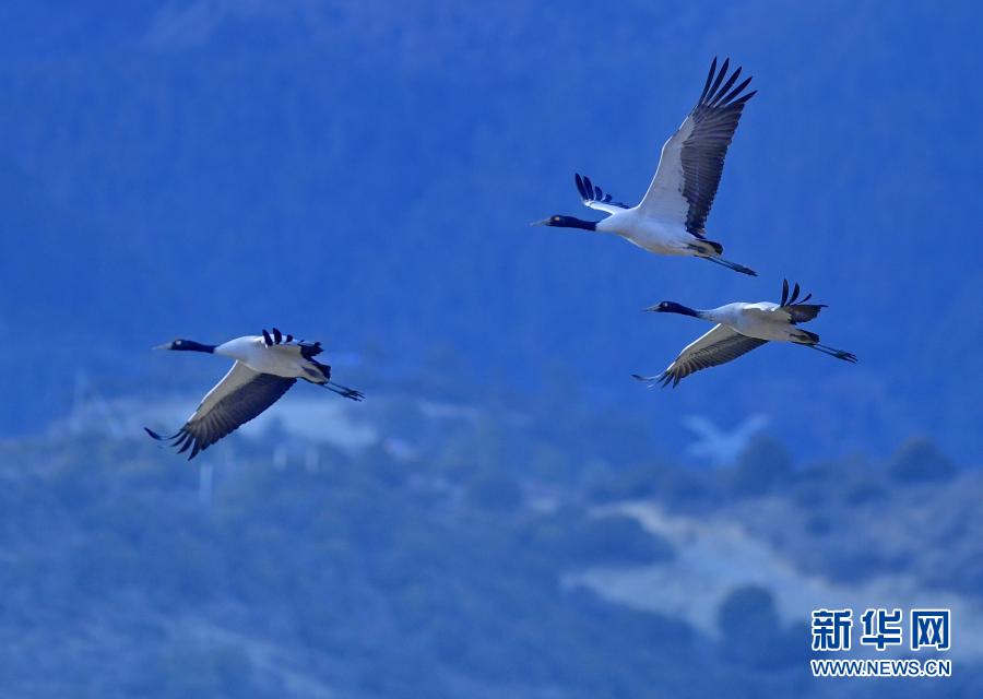 黑頸鶴在西藏雅尼國家濕地公園上空飛舞(2月1日攝)。