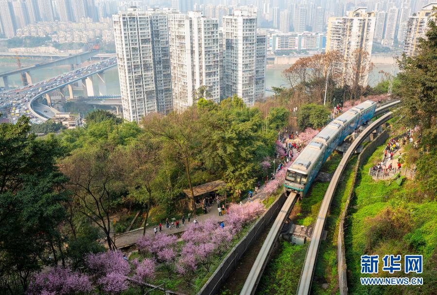 初春時節(jié),重慶氣溫逐漸回暖,暖陽里的山城春意盎然。在重慶軌道交通2號線佛圖關段,山城步道上的梅花簇簇綻放,單軌列車穿越花海,組成一幅賞心悅目的獨特城市景觀。