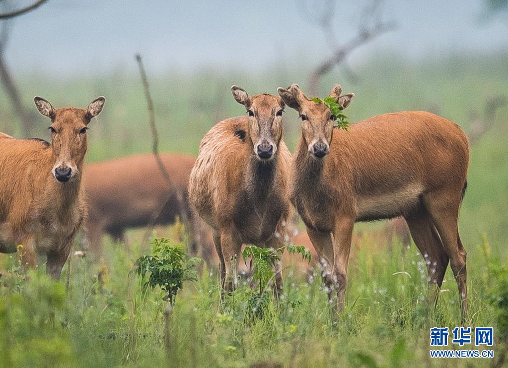 5月17日,一群麋鹿在石首麋鹿國家級自然保護區內活動。新華社記者 肖藝九 攝