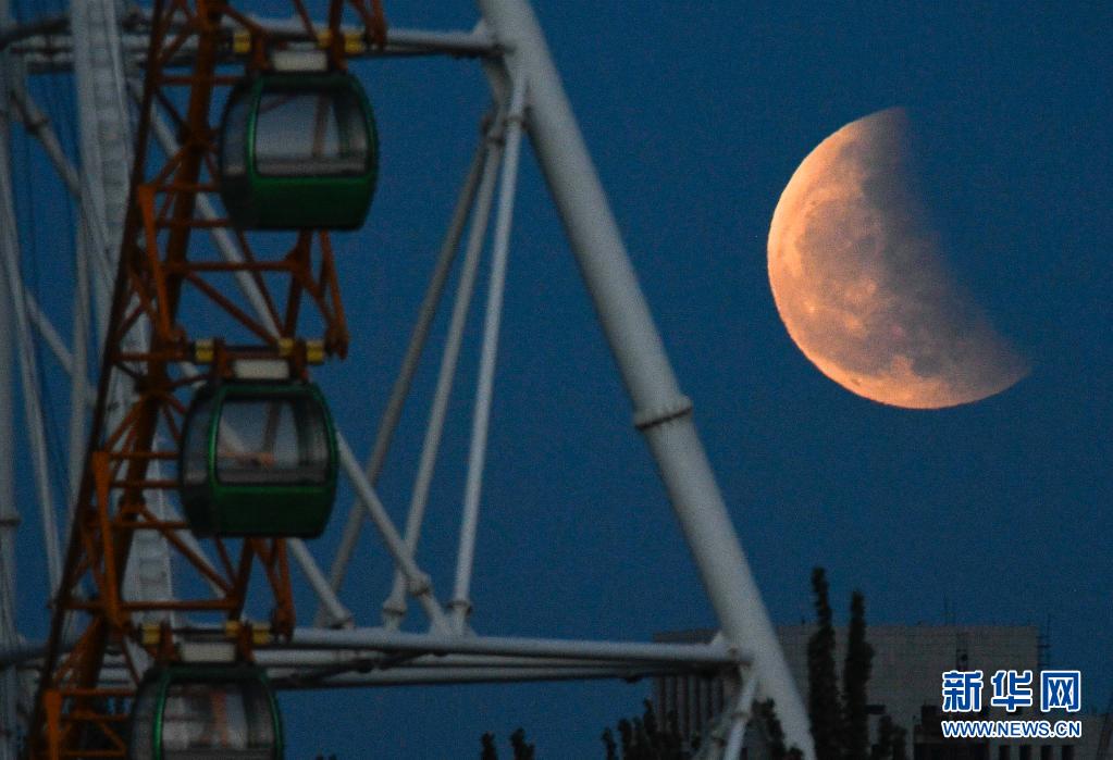 當日,本年度“最大最圓月(也稱‘超級月亮’)”與月全食(也稱“紅月亮”)浪漫“邂逅”。