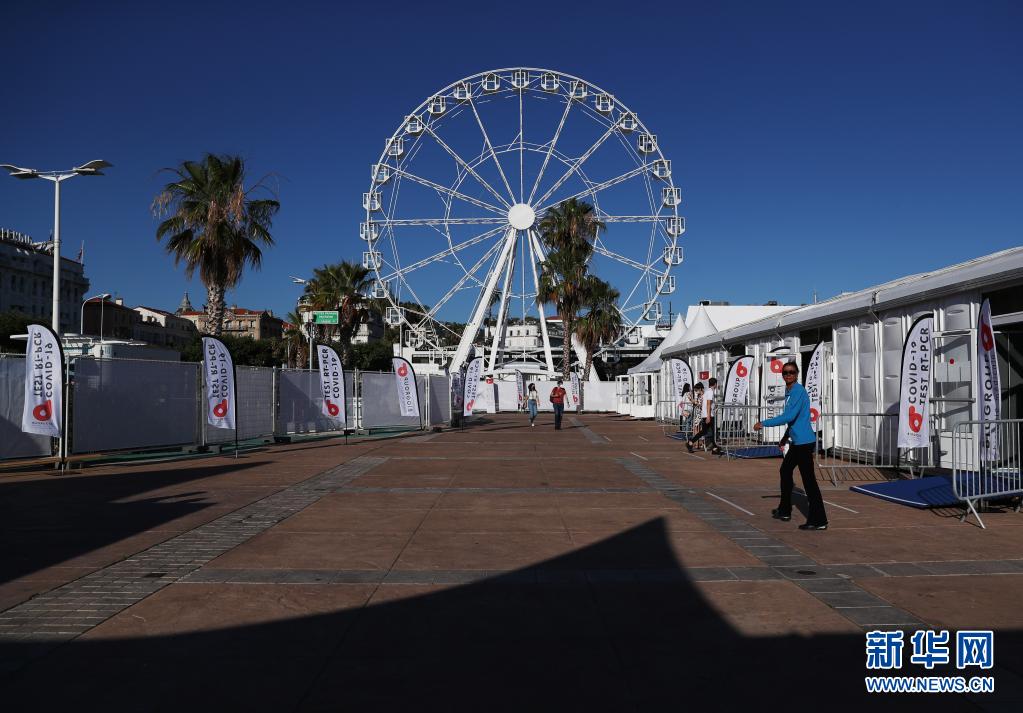 這是7月5日在法國戛納拍攝的為電影節(jié)注冊人員設(shè)立的新冠病毒檢測點(diǎn)。