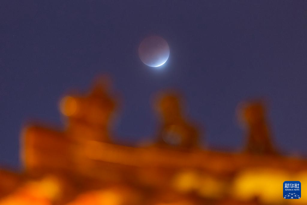 这是3月3日在北京永定门城楼附近拍摄的月全食。
