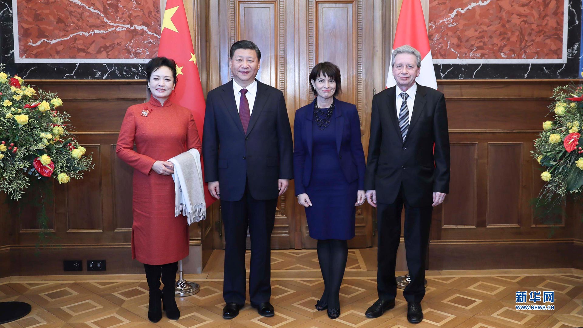 1月15日,國家主席習(xí)近平在伯爾尼出席瑞士聯(lián)邦委員會全體委員集體舉行的迎接儀式并致辭。這是瑞士聯(lián)邦主席洛伊特哈德夫婦在聯(lián)邦大廈迎接習(xí)近平和夫人彭麗媛。 新華社記者蘭紅光攝2017-01-16
