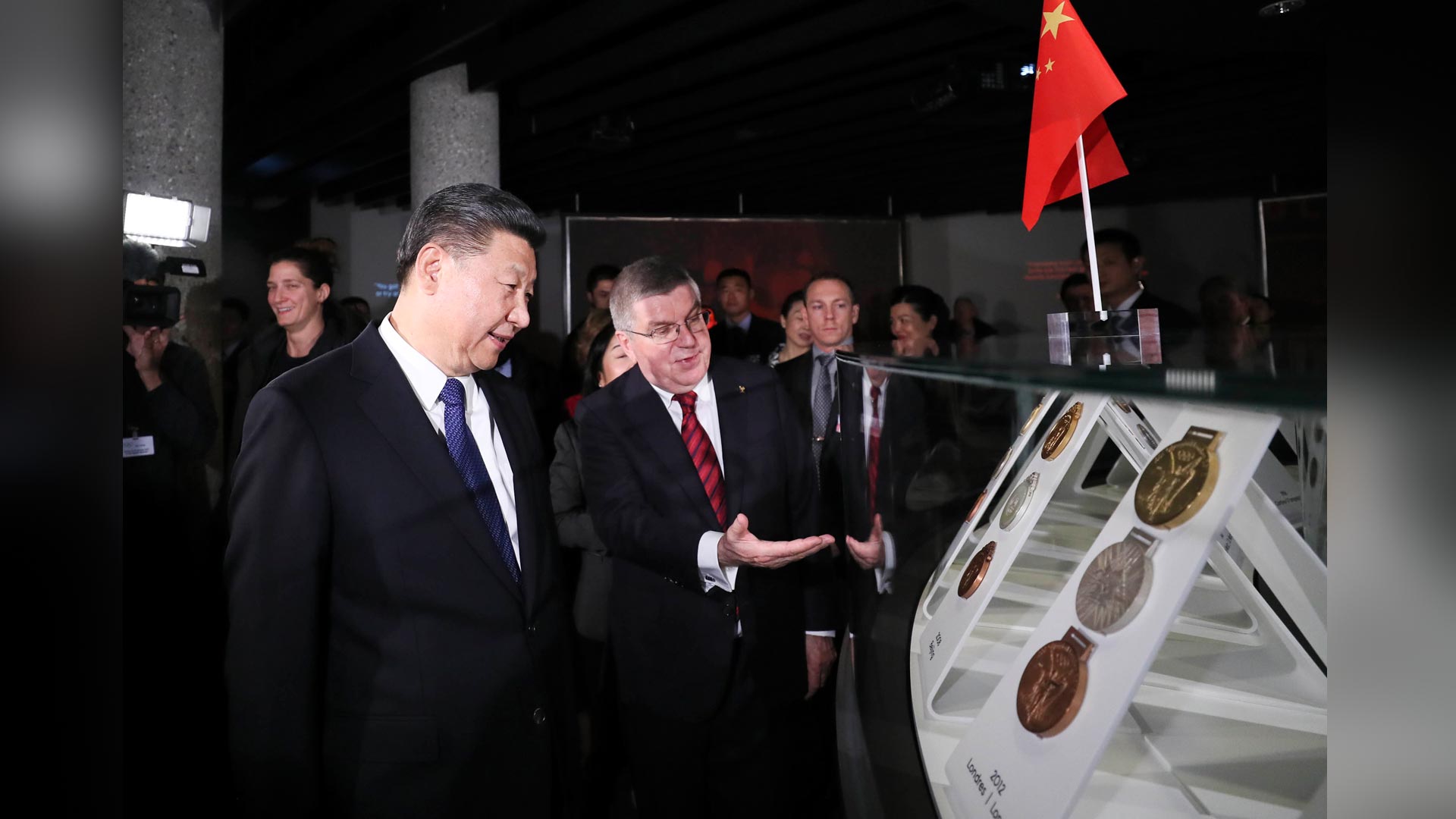 1月18日,國家主席習(xí)近平在瑞士洛桑國際奧林匹克博物館會見國際奧林匹克委員會主席巴赫。這是會見后,習(xí)近平在巴赫陪同下參觀往屆奧運(yùn)會獎牌展。新華社記者 蘭紅光 攝2017-01-19