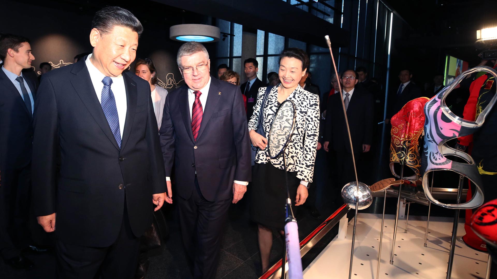 1月18日,國家主席習(xí)近平在瑞士洛桑國際奧林匹克博物館會見國際奧林匹克委員會主席巴赫。這是習(xí)近平在巴赫陪同下,參觀羽毛球世界冠軍李玲蔚用過的球拍。新華社記者 蘭紅光 攝2017-01-19