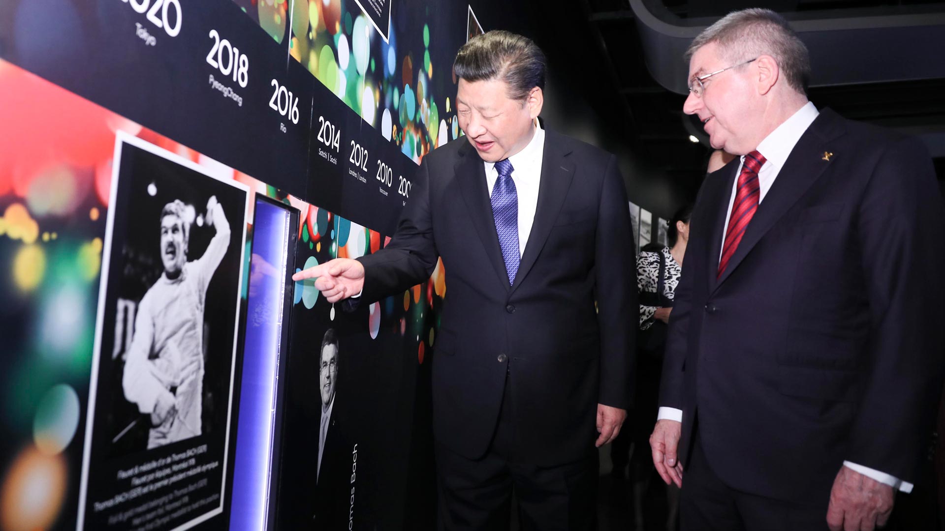 1月18日,國家主席習(xí)近平在瑞士洛桑國際奧林匹克博物館會見國際奧林匹克委員會主席巴赫。這是習(xí)近平在巴赫陪同下,參觀巴赫作為擊劍運(yùn)動員參加奧運(yùn)會的照片。新華社記者 蘭紅光 攝2017-01-19