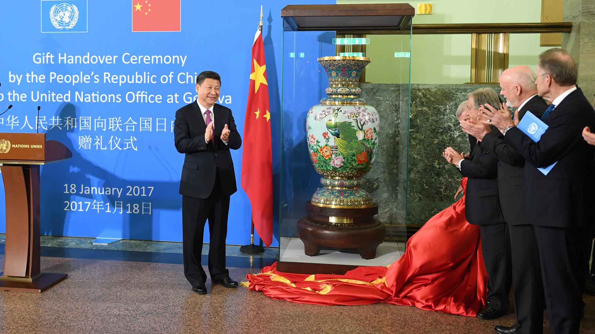 1月18日,國家主席習(xí)近平在瑞士日內(nèi)瓦萬國宮出席“共商共筑人類命運(yùn)共同體”高級別會議,并發(fā)表題為《共同構(gòu)建人類命運(yùn)共同體》的主旨演講。這是會議結(jié)束后,習(xí)近平出席中國向聯(lián)合國日內(nèi)瓦總部贈禮儀式。新華社記者 張鐸 攝2017-01-19