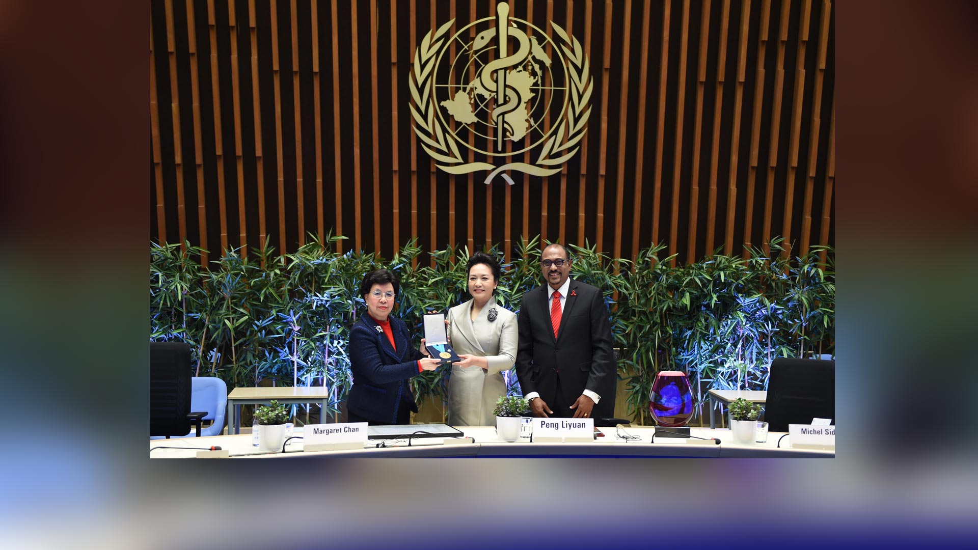 1月18日,國家主席習(xí)近平夫人、世界衛(wèi)生組織結(jié)核病和艾滋病防治親善大使彭麗媛應(yīng)世界衛(wèi)生組織總干事陳馮富珍和聯(lián)合國艾滋病規(guī)劃署執(zhí)行主任西迪貝邀請,在瑞士日內(nèi)瓦出席為她舉行的親善大使任期續(xù)延暨頒獎儀式。這是世界衛(wèi)生組織總干事陳馮富珍向彭麗媛頒發(fā)世衛(wèi)組織榮譽(yù)勛章。新華社記者謝環(huán)馳攝2017-01-19