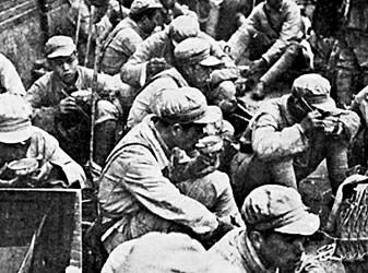 當時明文規(guī)定:進入市區(qū)的,只限指揮機關和戰(zhàn)斗部隊,后方輜重、騾馬一律不得進入市區(qū)。這樣,炊事員在郊外燒好了飯,甚至要走上二三十里路,才能送到戰(zhàn)士手里。路途遠,加上天下雨,有時一天只能走一個來回,戰(zhàn)士也就只能一天吃一餐。