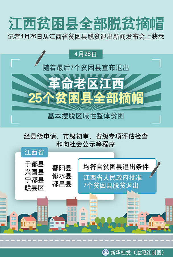 新華社南昌4月26日電(記者陳毓珊)26日,隨著最后7個貧困縣宣布退出,革命老區江西25個貧困縣全部摘帽,基本擺脫區域性整體貧困。