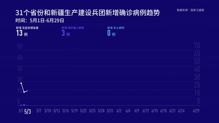 6月29日0—24時,31個省(自治區、直轄市)和新疆生產建設兵團報告新增確診病例19例,其中境外輸入病例11例(廣東4例,上海3例,四川3例,甘肅1例),本土病例8例(北京7例,上海1例);無新增死亡病例;新增疑似病例1例,為境外輸入病例(在上海)。