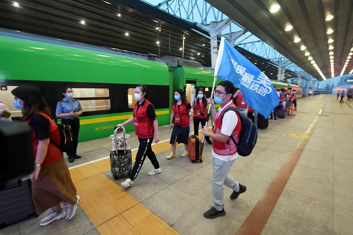 8月16日,參加2020年“發(fā)現最美鐵路”網宣活動的媒體記者乘坐列車出發(fā)。(中國國家鐵路集團有限公司供圖 楊寶森攝)