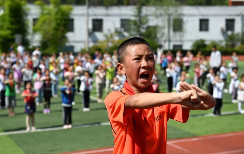 9月8日,在陜西平利老縣鎮(zhèn)中心小學的操場上,學生沈首洋(前)在大課間武術操上領操。新華社記者 李一博 攝