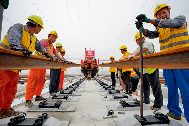 8月17日,中鐵十二局的工人在安裝京雄城際鐵路最后一段鋼軌。當(dāng)日,京雄城際鐵路全線軌道貫通 邢廣利攝