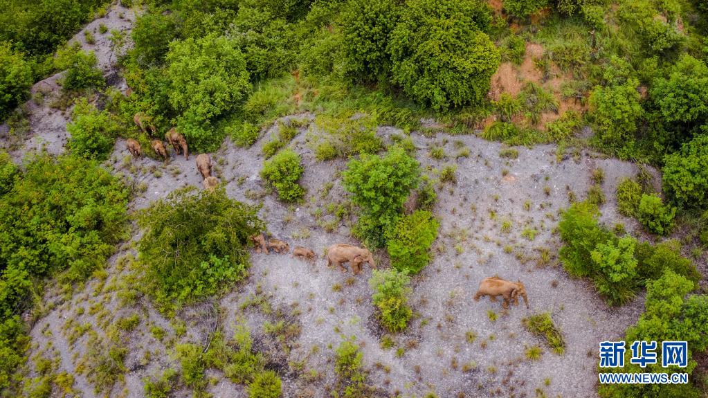 這是5月28日在云南省玉溪市峨山縣境內拍攝的象群(無人機照片)。新華社記者 胡超 攝