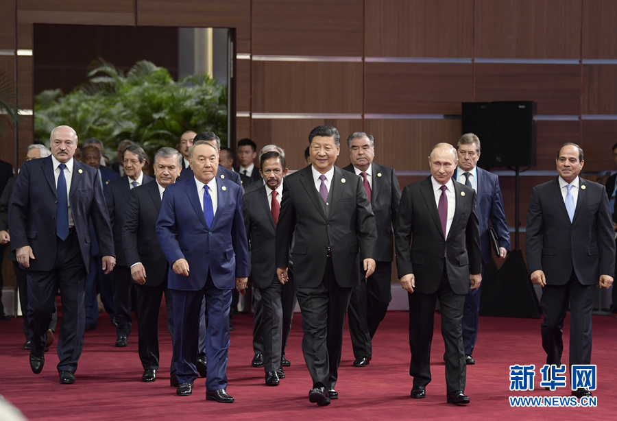 4月26日,國家主席習近平在北京出席第二屆“一帶一路”國際合作高峰論壇開幕式,并發(fā)表題為《齊心開創(chuàng)共建“一帶一路”美好未來》的主旨演講。這是習近平和出席開幕式的外方領導人共同步入會場。 新華社記者李學仁攝