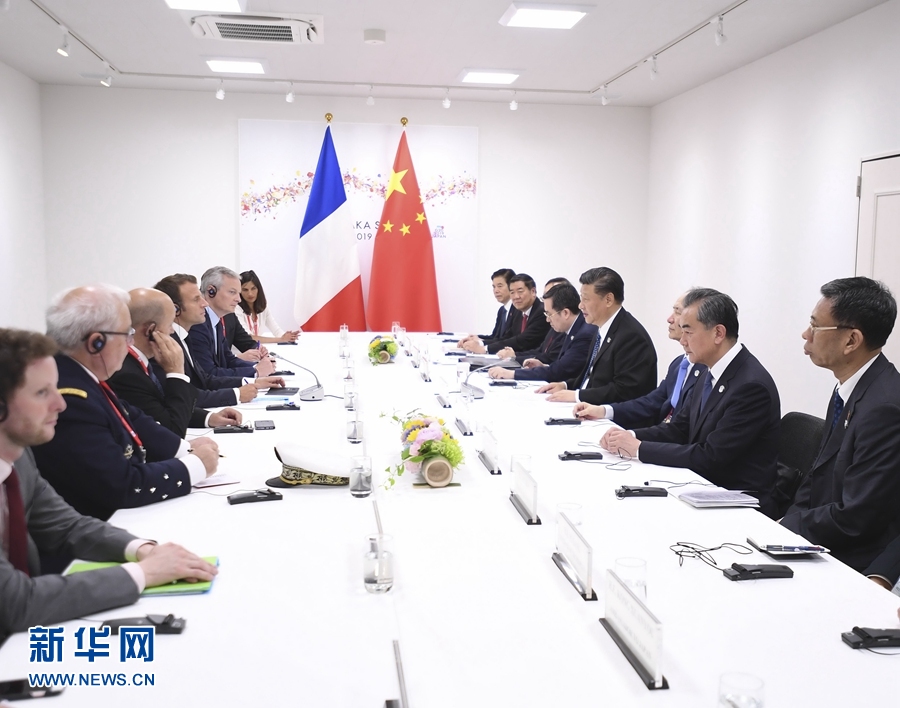 6月29日,國家主席習近平在大阪會見法國總統馬克龍。 新華社記者 燕雁 攝