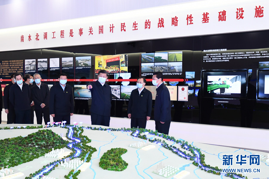 一個大型沙盤模型直觀地呈現了中國大地上水資源大范圍大規??鐓^域調配的壯闊景象,習近平總書記駐足凝望——