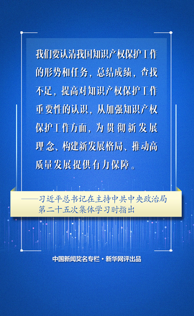 近日,中共中央政治局就加強(qiáng)我國知識(shí)產(chǎn)權(quán)保護(hù)工作舉行第二十五次集體學(xué)習(xí),習(xí)近平總書記在主持學(xué)習(xí)時(shí)發(fā)表重要講話,回顧總結(jié)我國知識(shí)產(chǎn)權(quán)保護(hù)工作取得的歷史性成就,深刻闡述知識(shí)產(chǎn)權(quán)保護(hù)工作的重要性,對(duì)全面加強(qiáng)知識(shí)產(chǎn)權(quán)保護(hù)工作提供了明確思路和行動(dòng)指南。