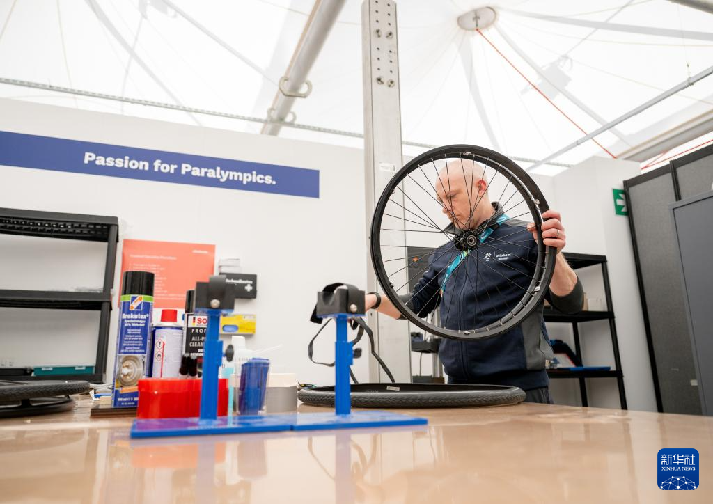3月3日,工作人员在残奥村内的维修服务中心为运动员们维修轮椅。