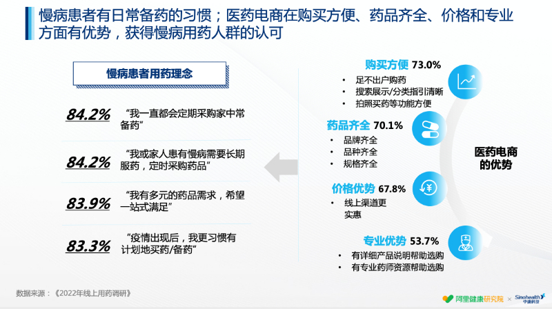 受到新冠疫情影响,线上购药近年来增长迅速,也改变了大家的购药习惯,这点不仅体现在人群特征上,从线下到线上,从即时性购药到计划性备药等均有变化。《白皮书》显示,疫情出现后,有近八成消费者习惯于有计划备药,近九成慢病患者因为线上购药方便、药品齐全、价格和专业等优势,表示“我一直都会定期采购家中常备药”。