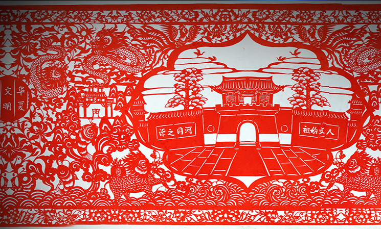 于是我決定回家專門剪紙,但是我父母認為鉸花都是老婆婆們閑著沒事做的事,你一個男孩子還是應該好好賺錢。就這樣我跟父母僵持了很久,但最后還是我拗著性子從外邊回到了我們農村老家,開始尋找會剪紙的老人,去記錄、去詢問、學習我們地區傳統的剪紙民俗知識。因為現在像剪紙這個藝術,在我們的地區還僅是一些老人出自一些喜好去剪、去做,但隨著這些老人的去世,這些作品也就會隨著一把火被燒掉。我希望我能把這些東西都保留下來,我希望有更多的人去了解我們地區的剪紙文化,所以我就下決心收集這些剪紙的資料,去申報非物質文化遺產名錄。想要申報還要去做很多的事情,一是去尋找這些傳世的老作品,另外就是要擴大孟津剪紙的影響力,參加各種比賽去獲獎。那時我白天去尋找老藝人,晚上就自己在屋里埋頭創作,每天晚上都會剪到凌晨一點多。我媽本來是反對的,但是當她看到每晚我都會剪到很晚,她就明白了我是真心喜歡這個事兒,就慢慢地開始心疼我。后來她也幫助我開始粘貼,像我剪的《都說我孟津好風光》,這個作品長13米,沒有那么長的紙,我們就一起粘貼。花了三個多月剪完,家里邊沒有那么大粘貼裝裱的空間,我父母就站在我們家院子的平房頂上一起把它鋪開,一個一個地粘起來裱好。