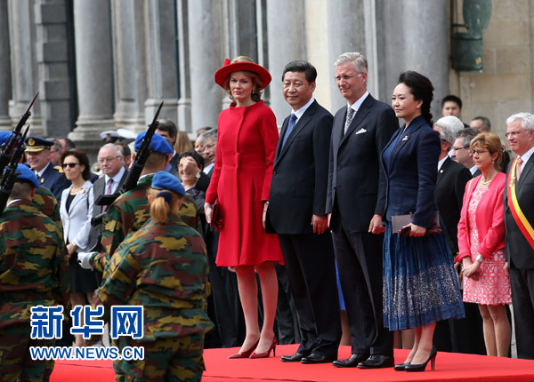 當(dāng)?shù)貢r(shí)間1日下午,習(xí)近平離開比利時(shí)布魯日市啟程回國。離開前,比利時(shí)國王菲利普在布魯日廣場為習(xí)近平舉行隆重歡送儀式。習(xí)近平和夫人彭麗媛,菲利普國王和瑪?shù)贍柕峦鹾笠煌饺霃V場。習(xí)近平在菲利普國王陪同下檢閱儀仗隊(duì)。軍樂隊(duì)奏中比兩國國歌,兩國元首共同檢閱儀仗隊(duì)分列式。