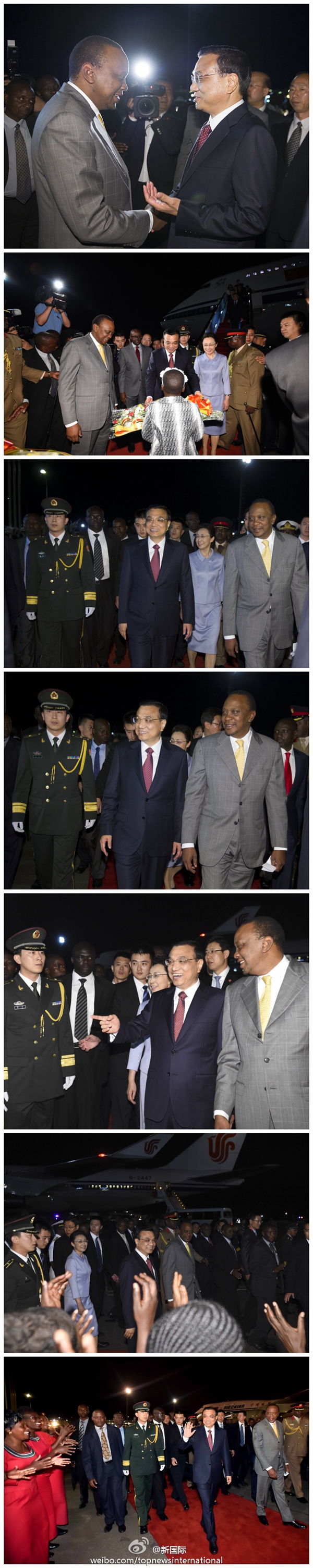 ????新華網(wǎng)北京5月10日電? 據(jù)新華社“新國(guó)際”微博報(bào)道,李克強(qiáng)總理9日晚乘專機(jī)抵達(dá)內(nèi)羅畢,肯尼亞總統(tǒng)肯雅塔和副總統(tǒng)魯托率肯政府高級(jí)官員到機(jī)場(chǎng)迎接,當(dāng)?shù)孛癖娨允⒋蟮奶厣褡甯栉瑁瑲g迎中國(guó)貴賓到來(lái)。