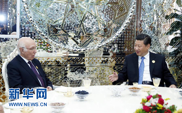 ????9月12日,國家主席習近平在杜尚別會見巴基斯坦總理國家安全和外事顧問阿齊茲。新華社記者鞠鵬攝