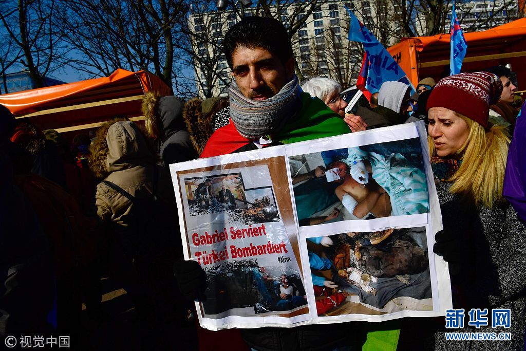當地時間2018年3月3日,德國柏林,當地民眾舉行游行,抗議土耳其對敘利亞阿夫林地區的庫爾德人采取軍事行動。(圖片來源:視覺中國)