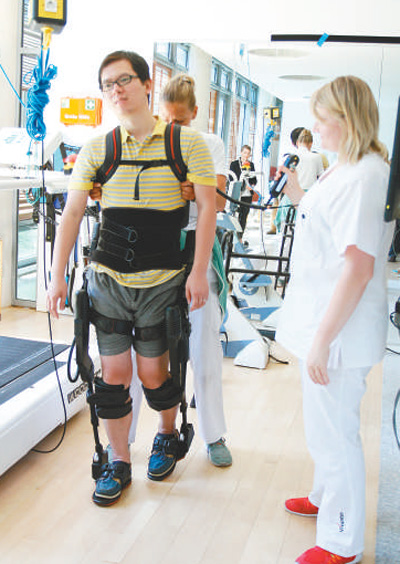民眾在德國體驗背負式康復機器。記者 管克江 攝