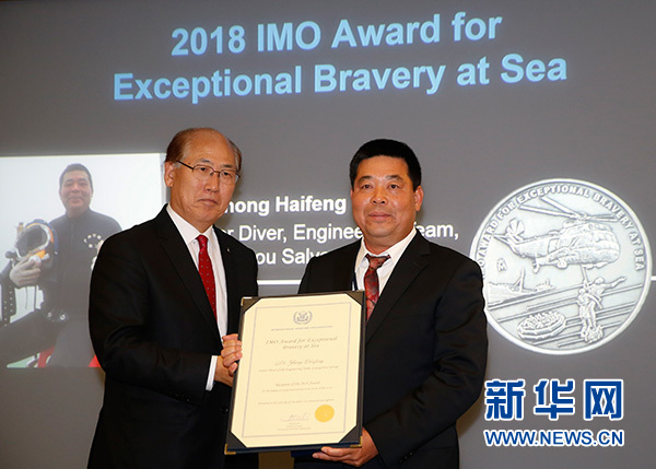 新華社倫敦12月7日電(記者梁希之)中國廣州打撈局高級潛水員鐘海鋒6日晚在倫敦獲得國際海事組織頒發的2018年度最高獎項——“海上特別勇敢獎”。