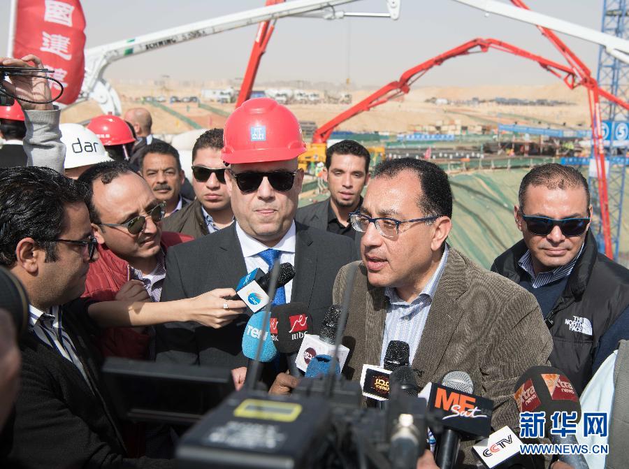 2月25日,在埃及開羅以東約50公里處的新首都中央商務(wù)區(qū),埃及總理穆斯塔法·馬德布利(右二)接受媒體采訪。 埃及總理穆斯塔法·馬德布利25日上午視察了由中國建筑股份有限公司承建的埃及新首都中央商務(wù)區(qū),并見證了標志塔主樓1.85萬立方米超大型混凝土基礎(chǔ)底板開盤澆筑。埃及新行政首都中央商務(wù)區(qū)位于首都開羅以東約50公里處,總占地面積約50.5萬平方米,包含20個高層建筑單體及配套市政工程。 新華社記者鄔惠我攝