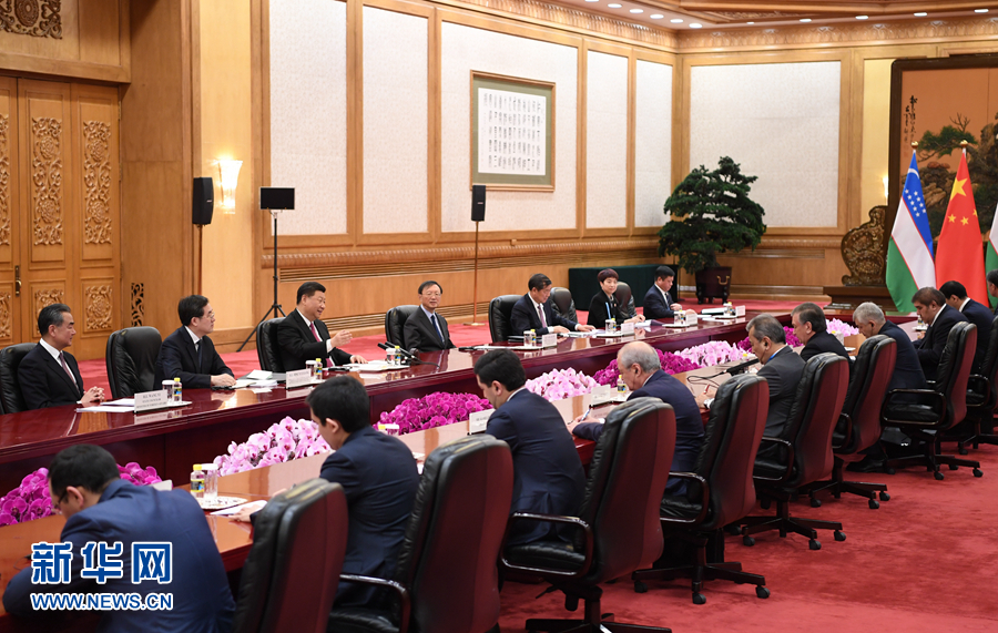 4月25日,國家主席習(xí)近平在北京人民大會堂會見烏茲別克斯坦總統(tǒng)米爾濟約耶夫。 新華社記者 殷博古 攝