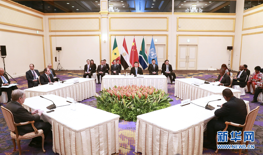 6月28日,國(guó)家主席習(xí)近平在大阪主持中非領(lǐng)導(dǎo)人會(huì)晤。中非合作論壇前任非方共同主席國(guó)南非總統(tǒng)拉馬福薩、非洲聯(lián)盟輪值主席國(guó)埃及總統(tǒng)塞西、中非合作論壇現(xiàn)任非方共同主席國(guó)塞內(nèi)加爾總統(tǒng)薩勒和聯(lián)合國(guó)秘書(shū)長(zhǎng)古特雷斯出席。新華社記者 龐興雷 攝