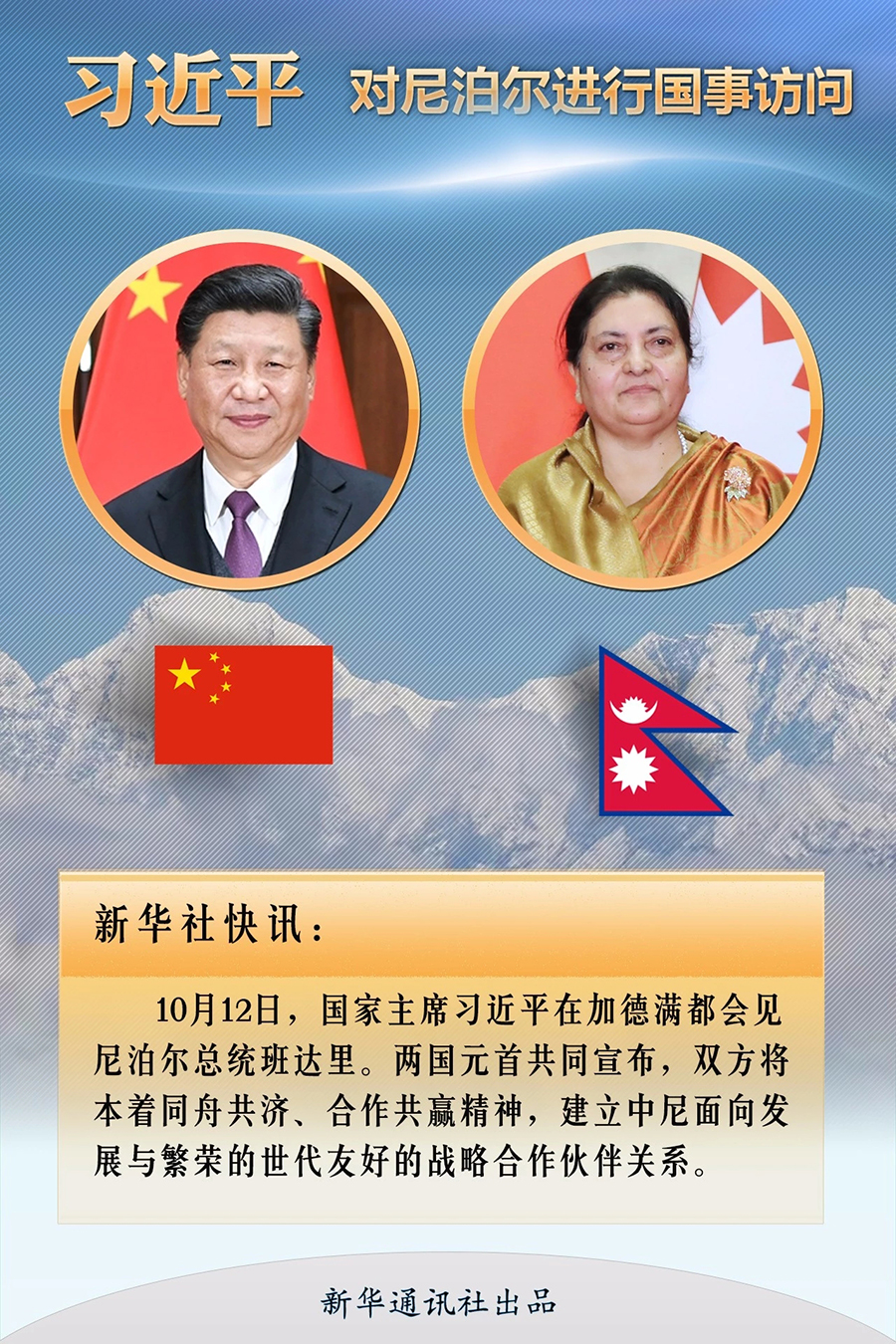 新華社加德滿都10月12日電 10月12日,國家主席習近平在加德滿都會見尼泊爾總統班達里。兩國元首共同宣布,雙方將本著同舟共濟、合作共贏精神,建立中尼面向發展與繁榮的世代友好的戰略合作伙伴關系。