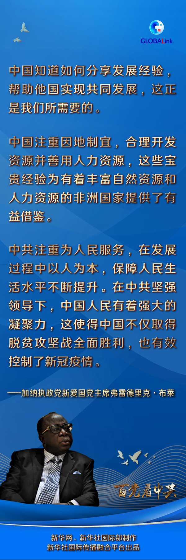 布萊對中國共產(chǎn)黨成立100周年表示祝賀。他祝愿中國在中共領(lǐng)導(dǎo)下取得更多成功,促進世界和平繁榮穩(wěn)定,同時希望加納新愛國黨和中共在未來能有更多交流合作。