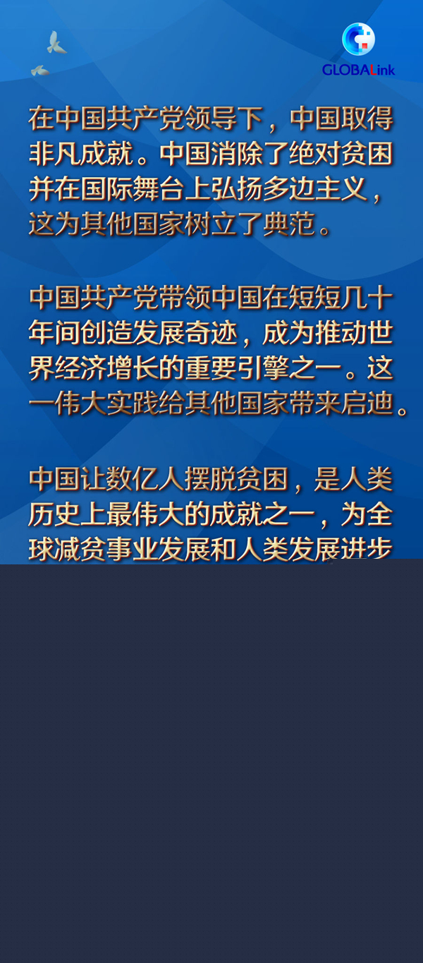 “新中國成立之時,中國還很貧窮。中國共產黨帶領中國在短短幾十年間創造發展奇跡,成為推動世界經濟增長的重要引擎之一。這一偉大實踐給其他國家帶來啟迪。”